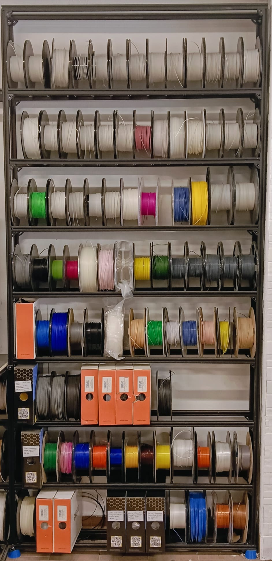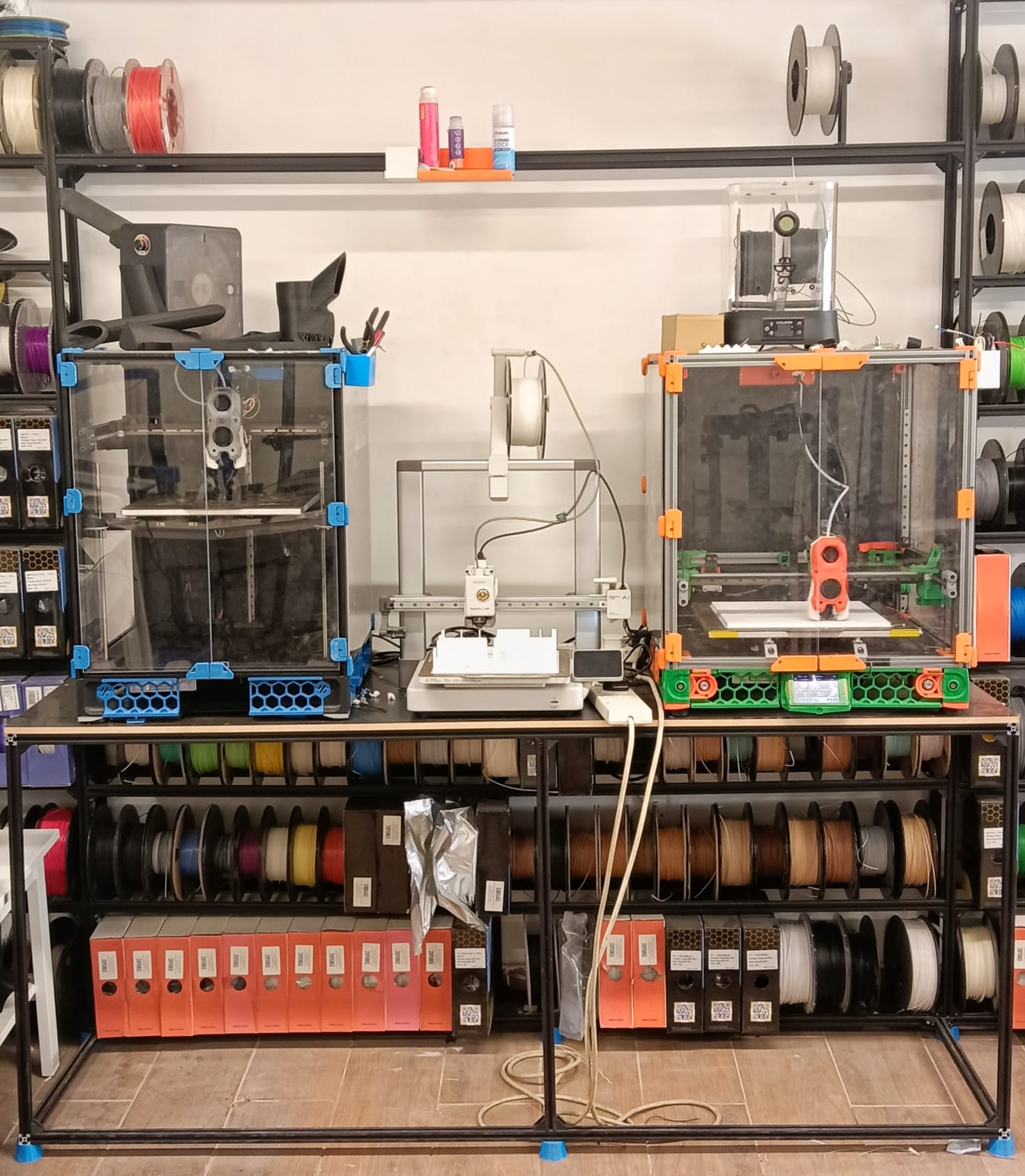 Equipped for 4 large-format printers, 2 material racks, and dedicated storage for tools, resins, or filaments.